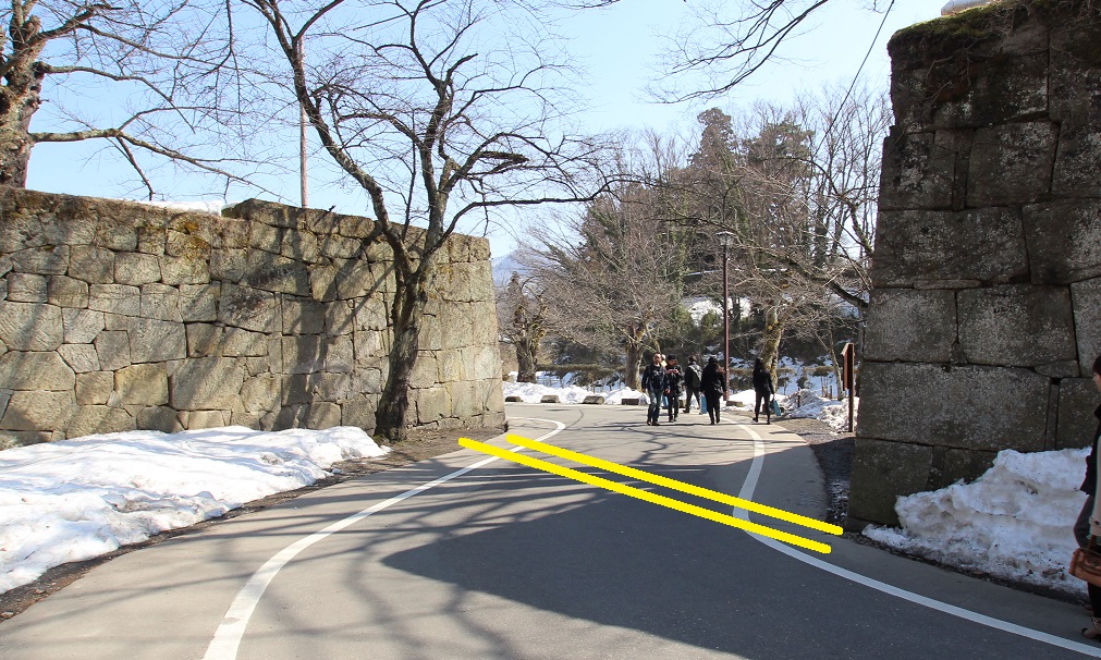 これは江戸城桜田門と同じ構造がみられ、城門を破ろうとする攻城兵は左方向から攻撃される。