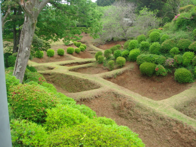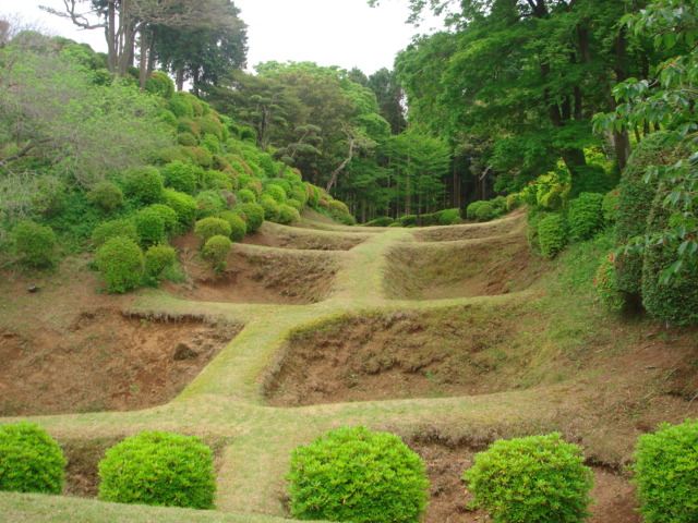 その幾重にも格子が連なったような堀が、北条氏の得意とする「障子堀」という遺構だと知るのは、後になってからだが、この時は、ただその美しさに魅せられた(芝生を張り替えたばかりだった)。