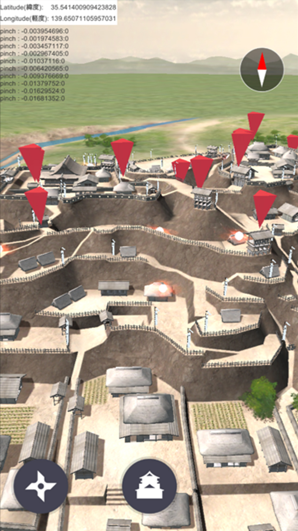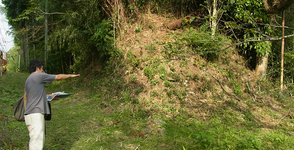 実際に城跡を歩き、遺構や地勢の確認をはじめ、位置情報(GPS)を活用し、実際の現場で高低差等を徹底的に収集し、精度の高い3Dデータを作成しております。